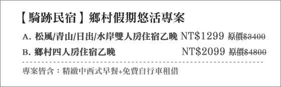 商品訊息簡述: 只要1299元起即可享有【騎跡民宿】原價最高4800元鄉村假期悠活專案:(A)松風/青山/日出/水岸雙人房住宿乙晚/(B)鄉村奶H房住宿乙晚,以上專案均含精緻中西式早餐+免費自行車租借!